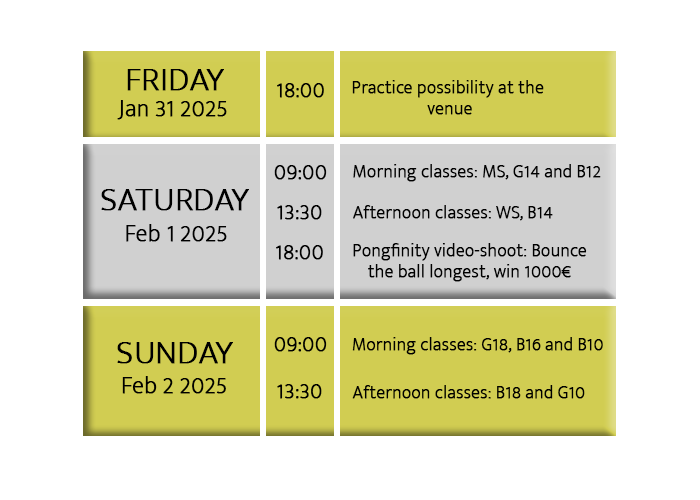 The meet & greet events as well as the Pongfinity video-shoot is free of charge for all participants of the tournament.