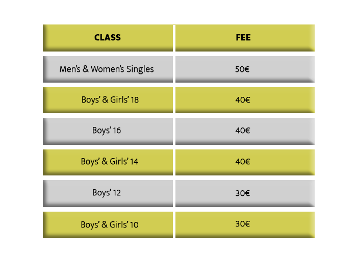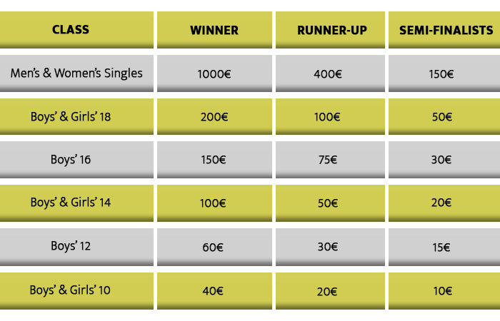 The finalists and semi-finalists of each class will receive a money-prize and a cup trophy. The total prize money for the tournament is 5500€.