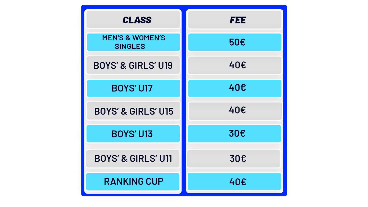 Compete in an international tournament with several junior classes and a high-level Men's and Women's singles. Over 3825€ in total prize money across classes!