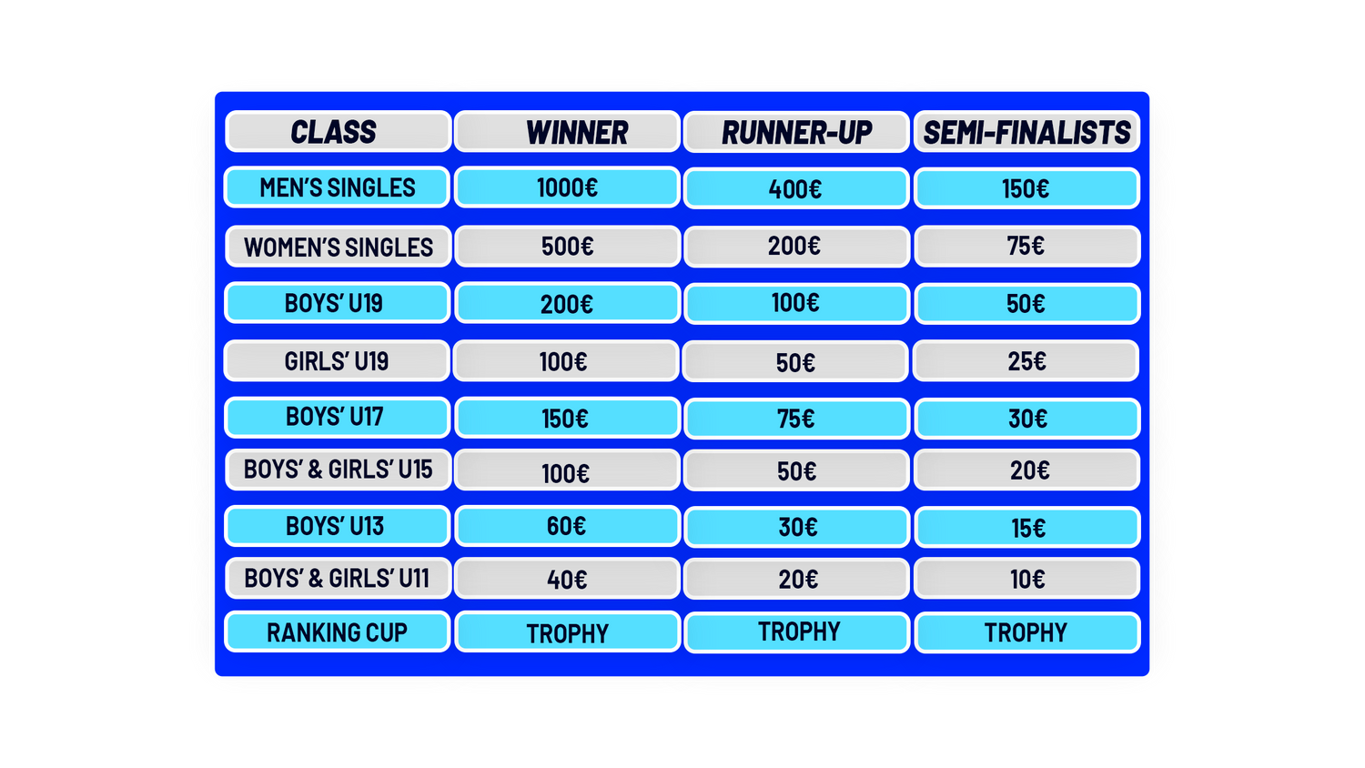 The finalists and semi-finalists of each class will receive a money-prize and a cup trophy. The total prize money for the tournament is 3450€.